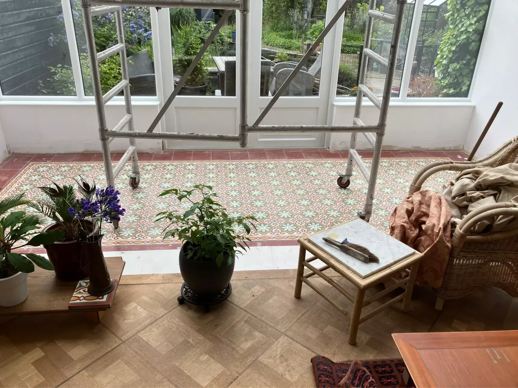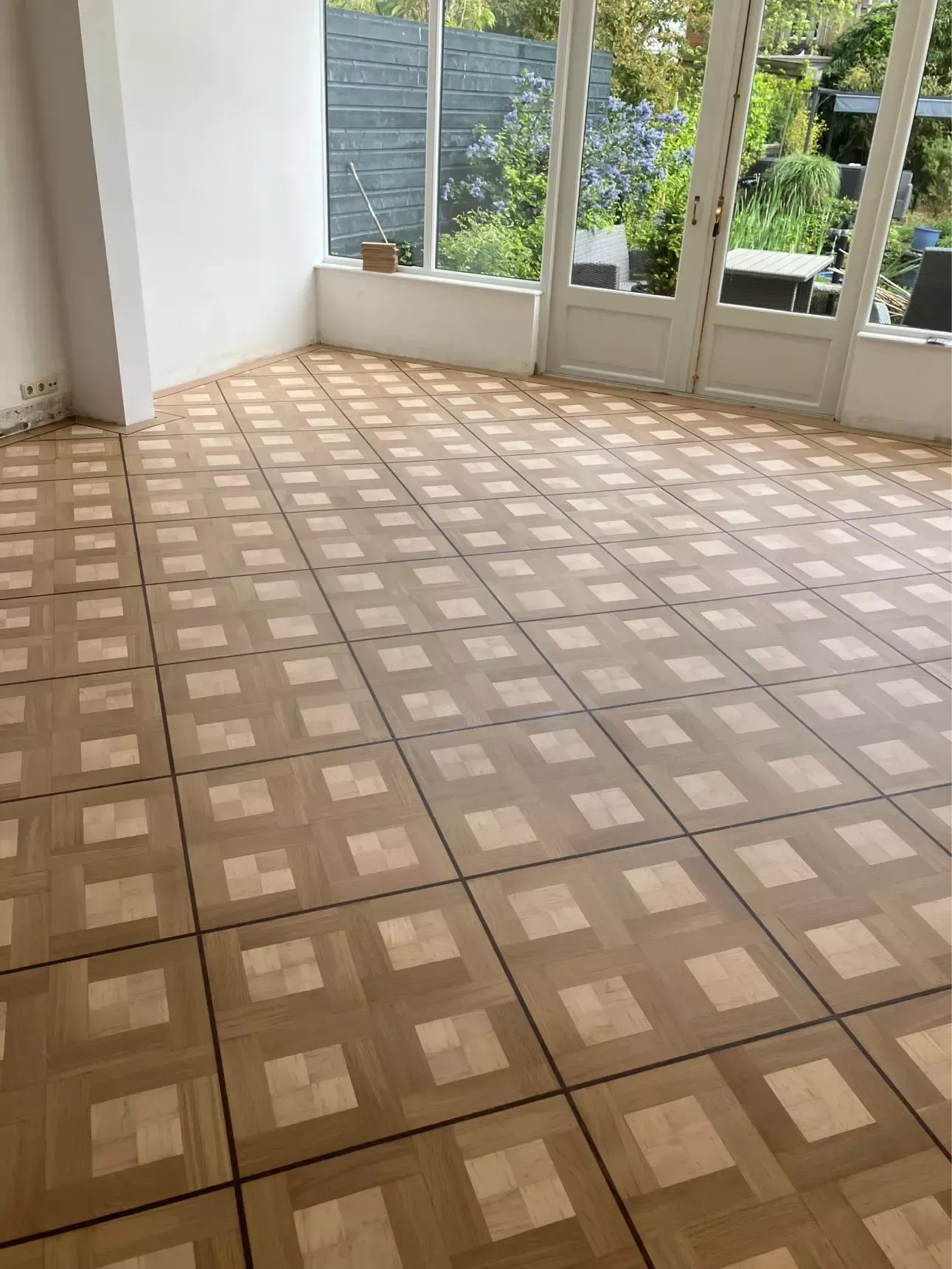 Omstreeks het jaar 1999 heeft Chris van der Meer een prachtig diagonaal blokpatroon gelegd van drie verschillende houtsoorten. Dit waren Canadees maple, Frans eiken QFQ en wengé biezen. De vloer was door de klant zelf bedacht en ontworpen en door ons als zodanig gerealiseerd. Echt een prachtig stukje vakwerk, geleverd door de toen pas 24 jaar oude Chris. Hij had het vak dus toen al goed in de vingers. In 2024 mochten wij bij dezelfde klant en dezelfde vloer weer een nieuwe uitdaging aangaan. De klant had van wat ooit een veranda was, een prachtige uitbouw laten maken door een bekende Delftse aannemer en wij werden gevraagd om de bestaande vloer aan te helen. Wij hebben dit als volgt gedaan: als eerste hebben wij ter plaatse alle maten nauwkeurig opgenomen en ook het hoogteverschil tussen de woonkamer opgemeten, zodat wij dit verschil op konden heffen. Wij hebben de tegelvloer eerst goed ontvet, geschuurd met een diamantschijf en behandeld met een 3K primer, om een goede hechting te verkrijgen.
