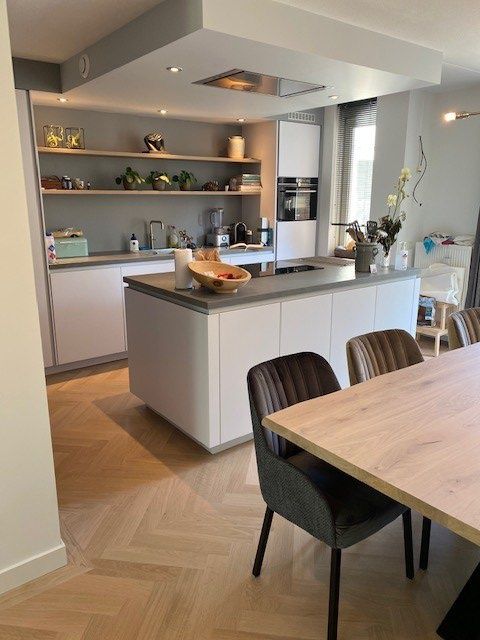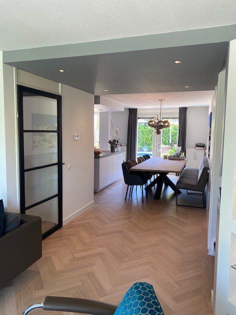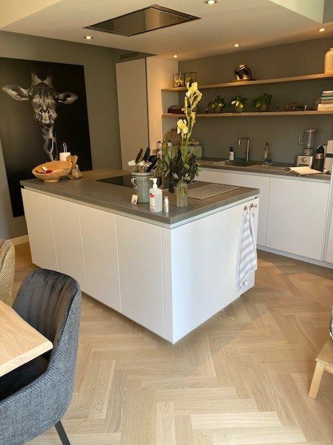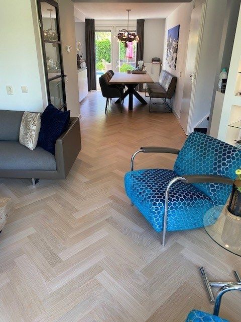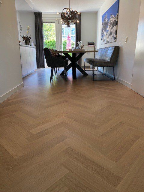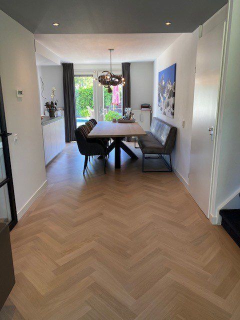 In deze stijlvolle woning heeft Parkethuys Delft een nieuwe visgraat parketvloer gelegd die naadloos doorloopt van de woonkamer naar de keuken met kookeiland. Het resultaat is een rustige en ruimtelijke basis die perfect aansluit bij het moderne interieur. De bewoners waren bijzonder enthousiast over de warme uitstraling en het vakmanschap waarmee de vloer is geplaatst.